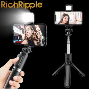 RichRipple 3 in 1 Integrated Monopod Tripod for Phone Portable be Folded Mini Selfie Stick Gimbal SLR Tripod Suitable Various Types of Phone Black with fill light,as picture