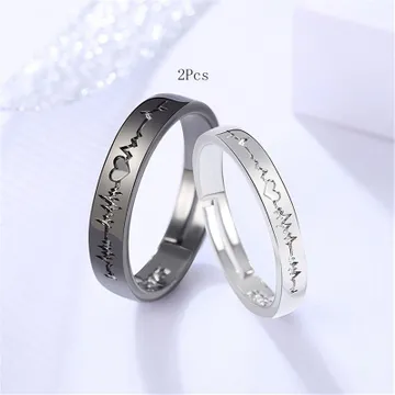 2Pcs/set Romantic Couple Rings For Women Men Punk Heart ECG Black White Forever Love Promise Wedding Ring Valentine'S Day Gift Lovers ring Adjustable openingLover's Ring,Adjustable Opening