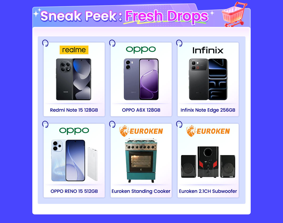 Sneak Peek: Fresh Drops:Redmi Note 15 128GB & Infinix Note Edge 256GB (AI Phone), OPPO A6X 128GB, OPPO RENO 15 512GB(With Gifts, Euroken 2.1CH Subwoofer , Euroken 3+1 Standing Cooker and more