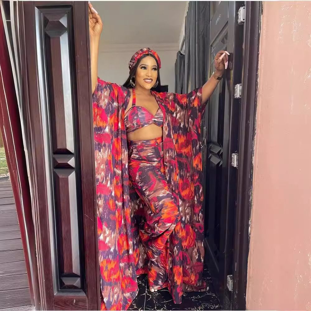African Abaya European American Sexy Print Suit Women Long Kimono 4 Piece Set Bra Top Pants Coat Headtie Lady Clothing