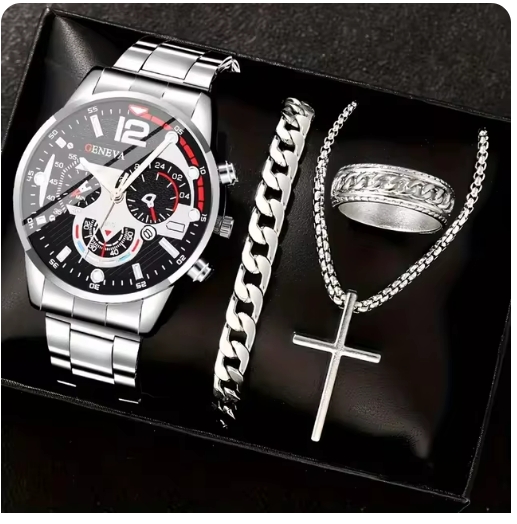 4pcs gold alloy Roman with calendar men's quartz watch and cross necklace bracelet ring set selected gift