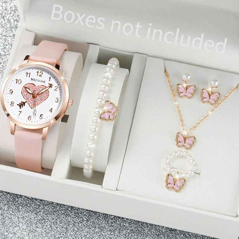 6PCS Fashion Women's Watch Earrings Rings Necklace Bracelet Set Ladies' Butterfly Jewelry Set Women's Wristwatch Leather Strap Love Dial Quartz Watch Ladies' Set Birthday Gift