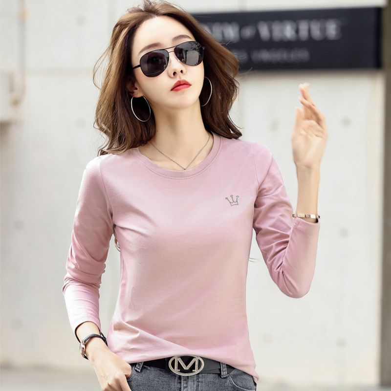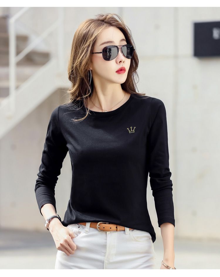Women's Solid Color Top Embroidered Crown Base Shirt Pure Cotton INS Style Slim-Fit Long-Sleeve T-Shirt for Ladies