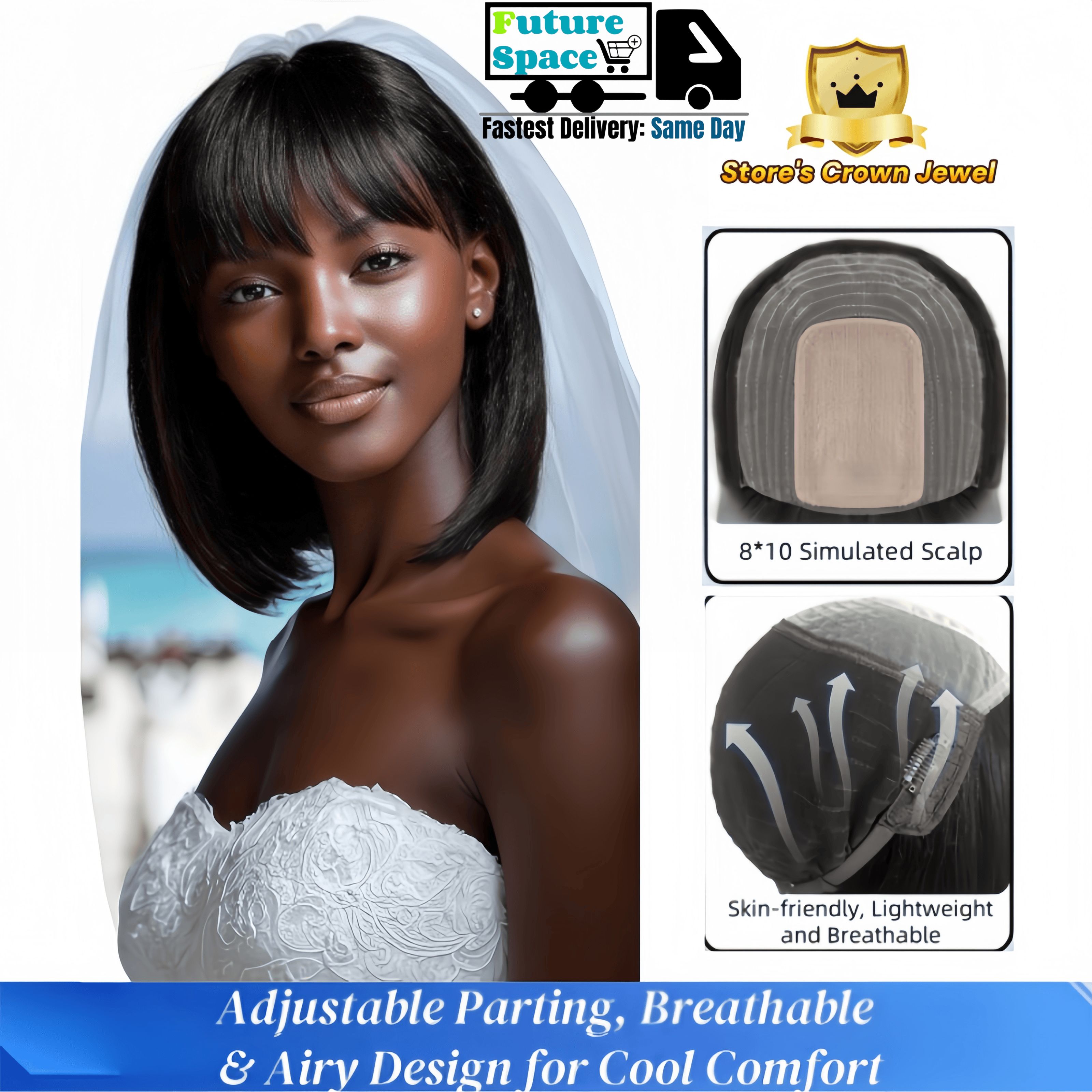 8*10 HD Lace Human Hair Bob Wigs - 12 Inch 150% Density | Ice Silk Base for African Heat (Natural Black, Pre-Cut Bangs, 3D Volumizing Crown, Adjustable Size, Gift)