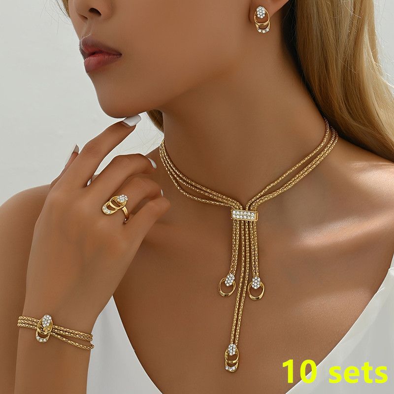 Fashionable and minimalist diamond studded gold necklace, collarbone chain earrings, ring versatile set Ladies' jewelry