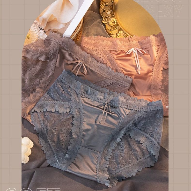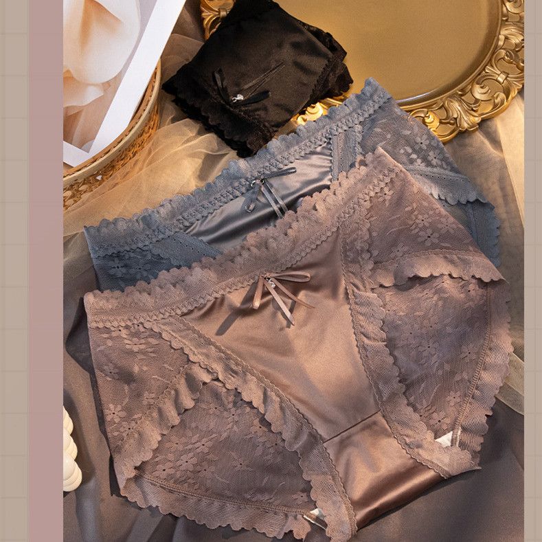 3Pcs Lace Women’s Mid-Rise Panties Satin Seamless Sexy Underwear Plus Size Jacquard Briefs Breathable Skin-Friendly Comfortable Lingerie