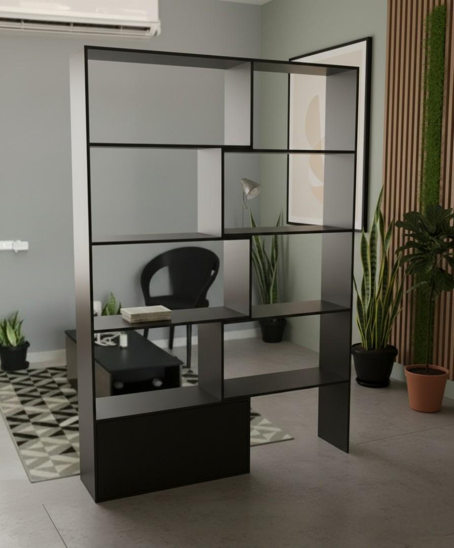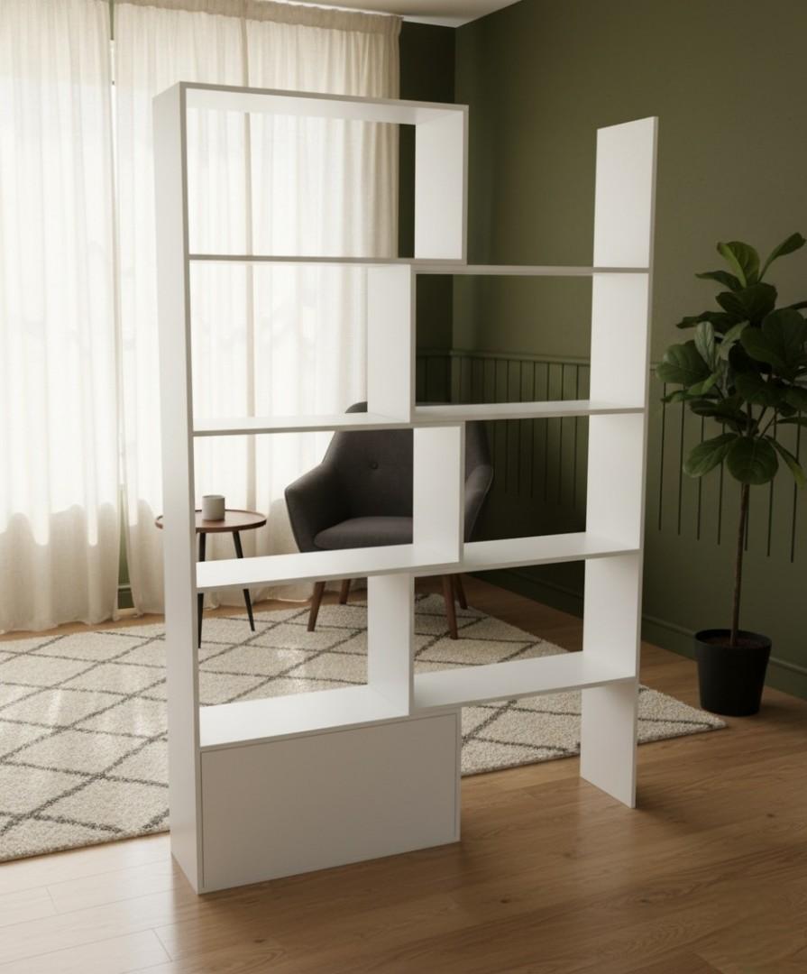 Expandable Modern Geometric Bookshelf Room Divider with Storage Cabinet | White, Black & Royal Teak Varieties | Versatile Home & Office Display Shelf Unit