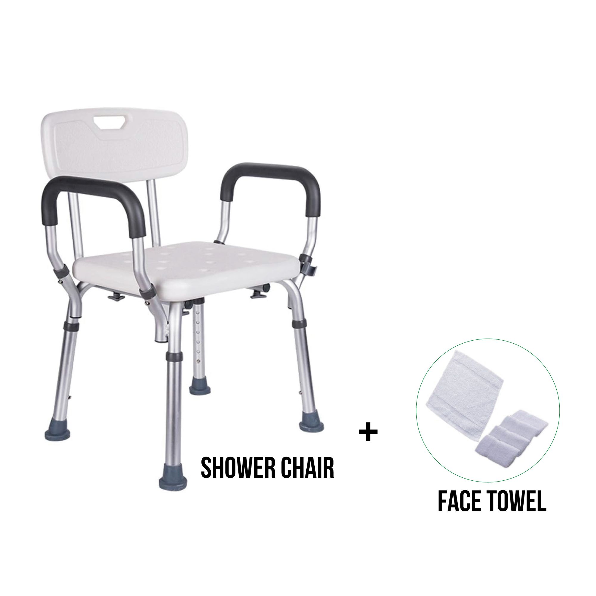 Adjustable Shower and Bath Bench with Padded Arms, Contoured Back and Textured Shower Chair Seat plus free scrubber