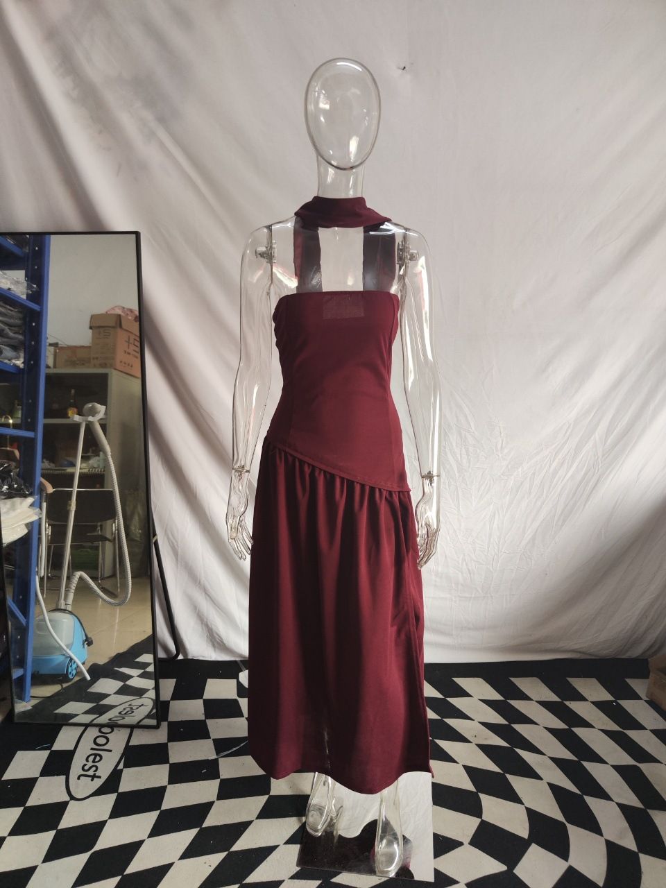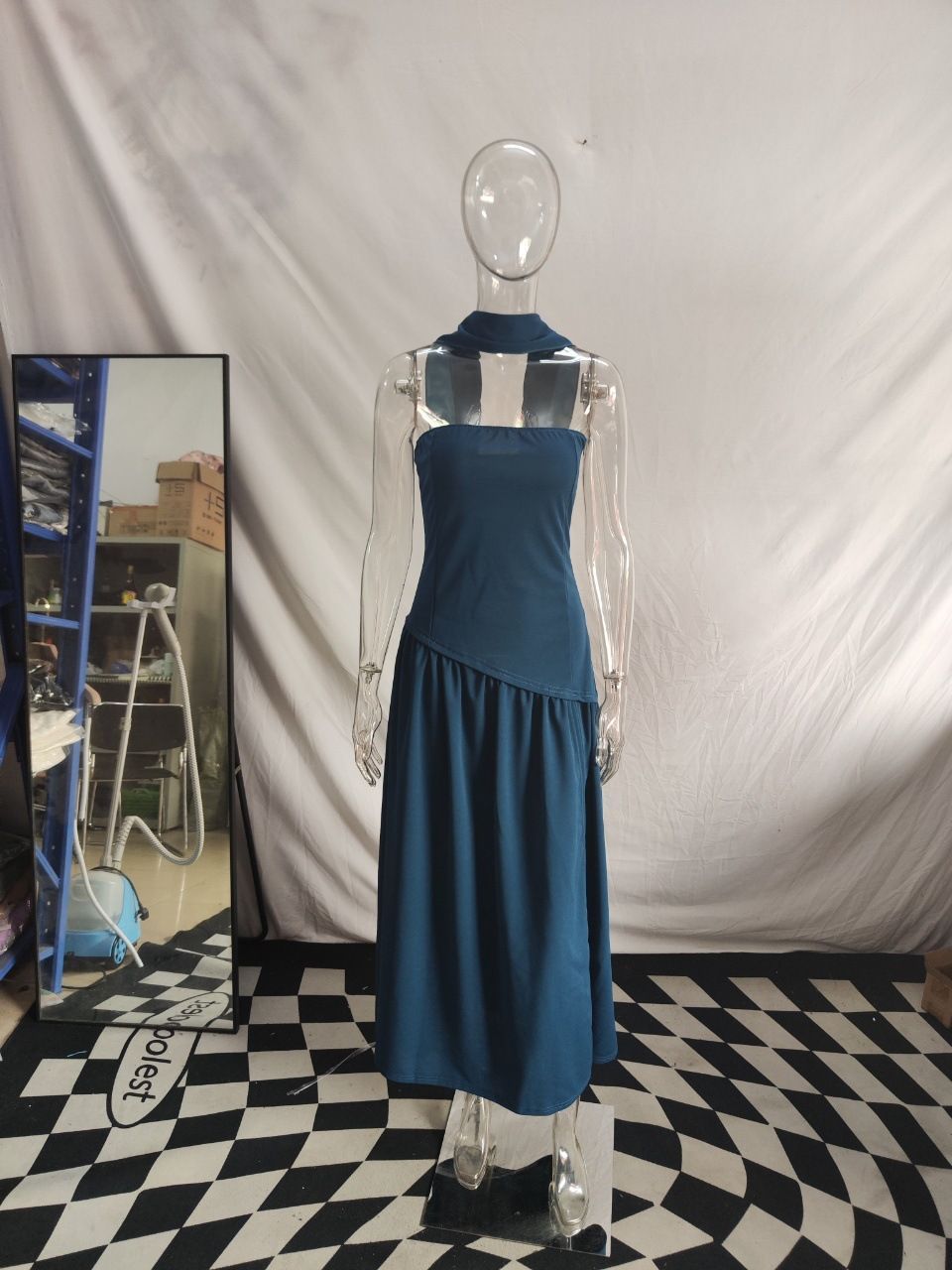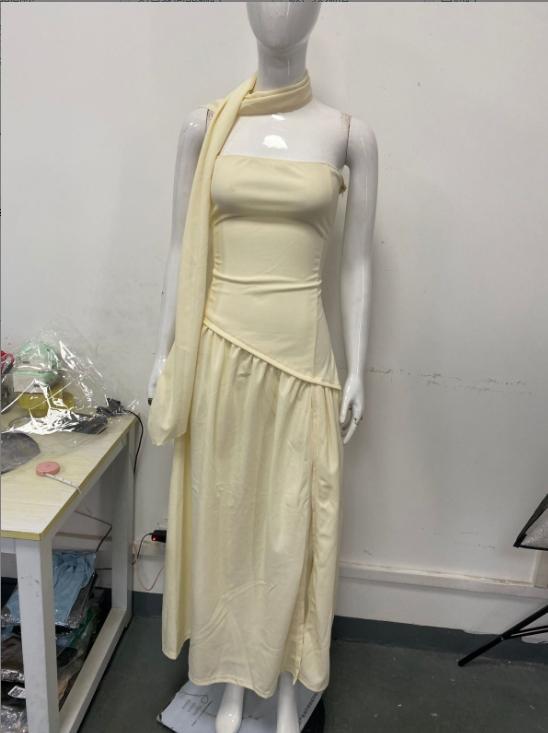 Cross border summer new European and American women's black and white contrasting scarf temperament sexy off shoulder split dress wholesale