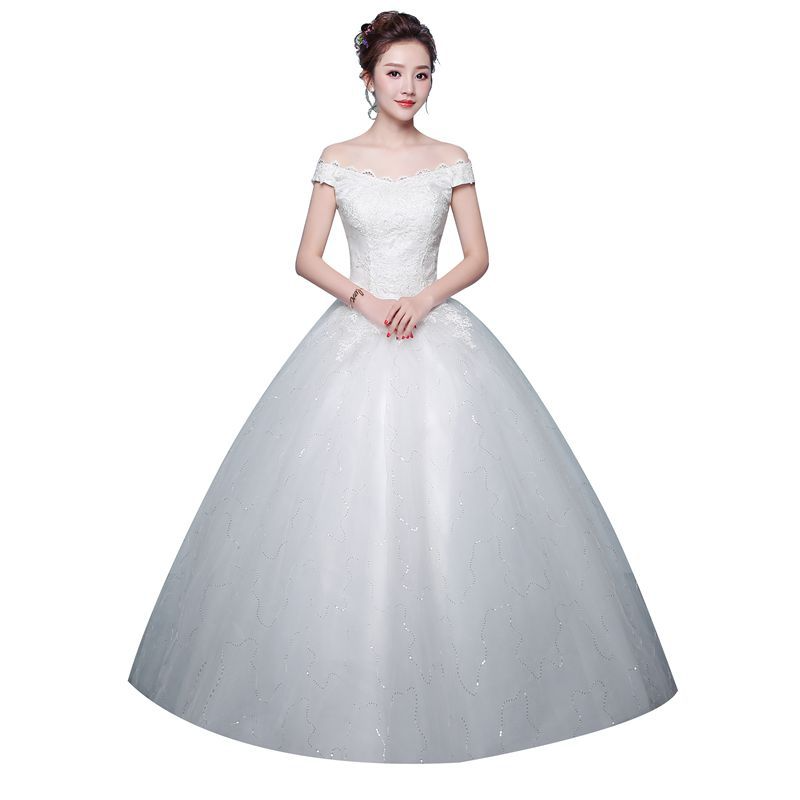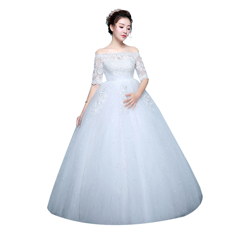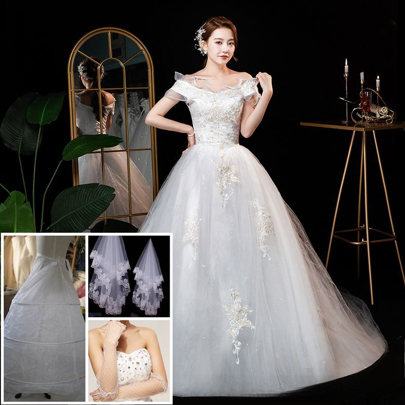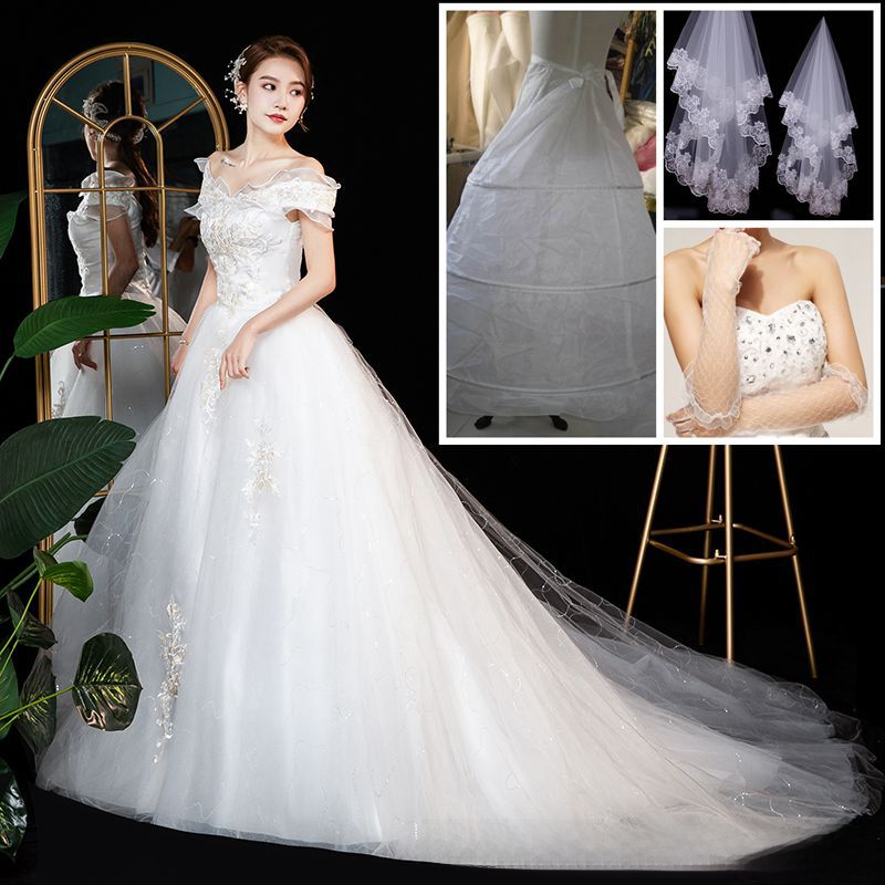 Light wedding dress 2025 new one-line shoulder-length bride slim V-neck trailing temperament princess forest main yarn