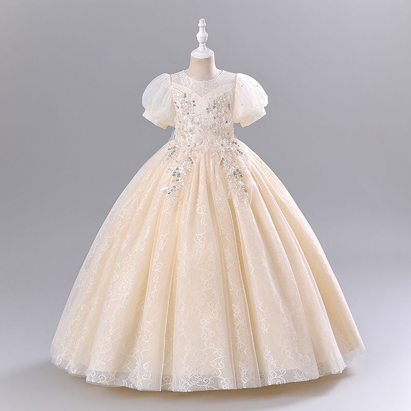 New high-end girls' dresses in summer: puff sleeves, round neck, fluffy gauze, princess dress, birthday party, school Christmas party, wedding dress, performance costume.