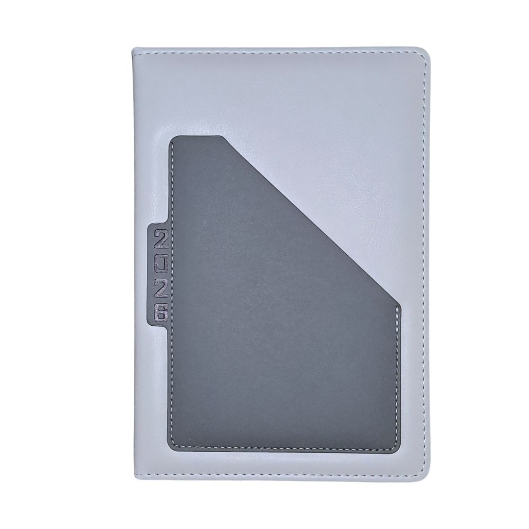 Premium 2026 Diary A5 Daily Planner GREY White PU Leather Hard Cover Executive Journal with Pocket Pouch New Year Classic Design Official Christmas Boxing Day Valentines Birthday 365 Calendar GRAY
