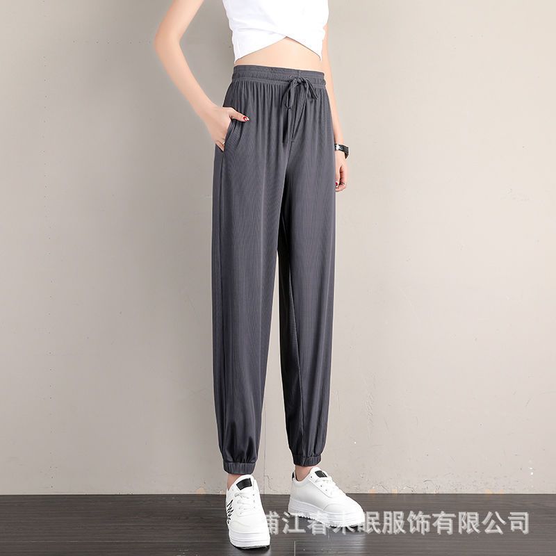 2*PC Ice silk sports pants for women, loose and ankle tied, summer thin casual sweatpants with a slimming effect, oversized wide leg lantern pants black S-75-90 pounds
