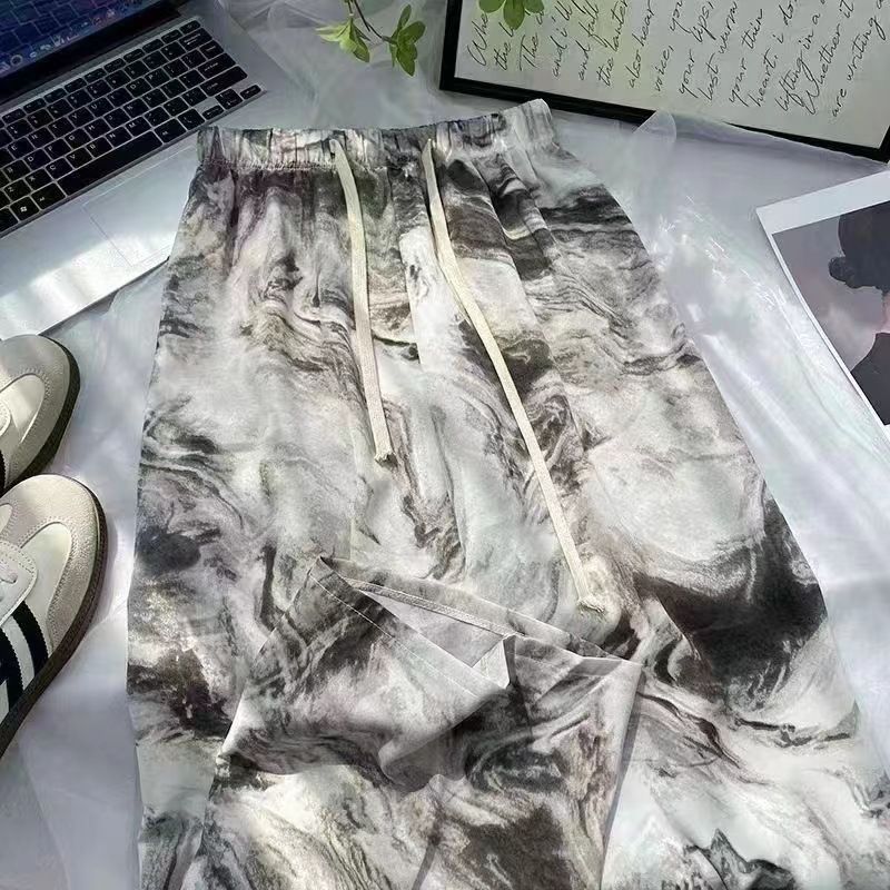 2*PC Printed ink wash Chinese style ice silk wide leg pants, second-generation Yamamoto pants for women, high waisted straight leg loose casual pants, walking pants for women Style_1 one size fits all
