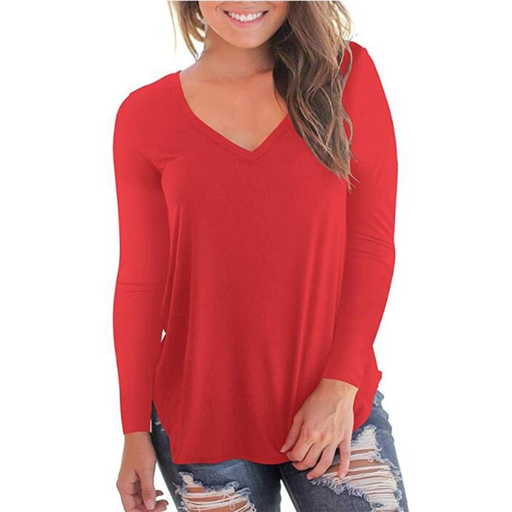 2019 European and American women's solid color base shirt Amazon Wish cross-border hot selling new V-neck long sleeved women's T-shirt black S