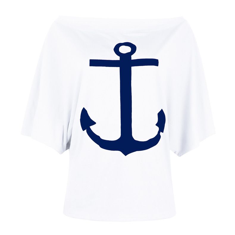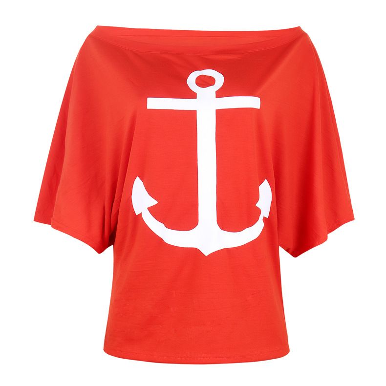 European and American cross-border new summer one collar plus size loose bat shirt with boat anchor print casual short sleeved T-shirt for women blue S