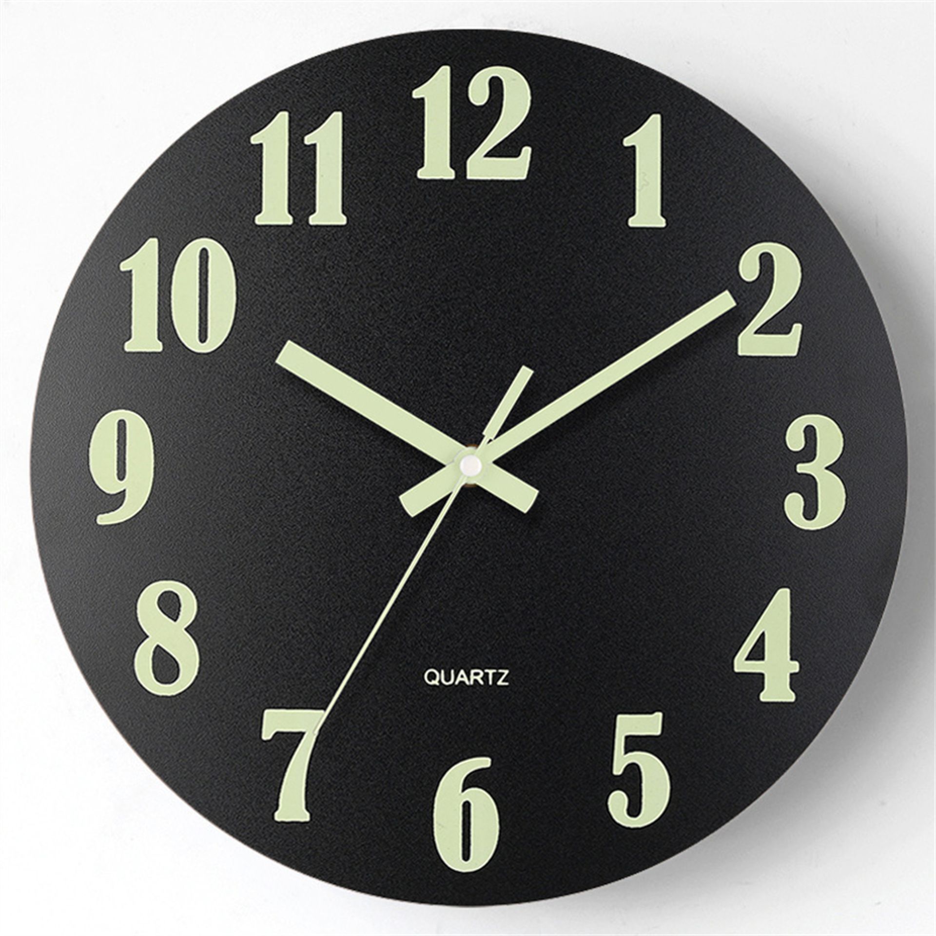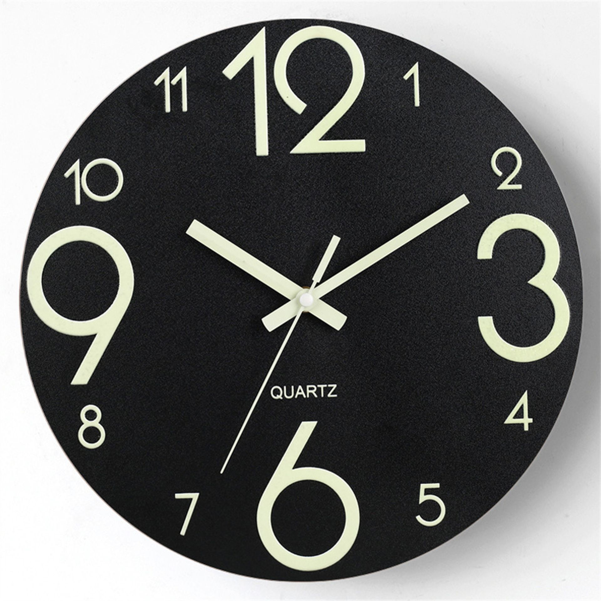 12-inch luminous wall clock with silent function, wooden surface with wood grain, glowing fluorescent panel in the clock face