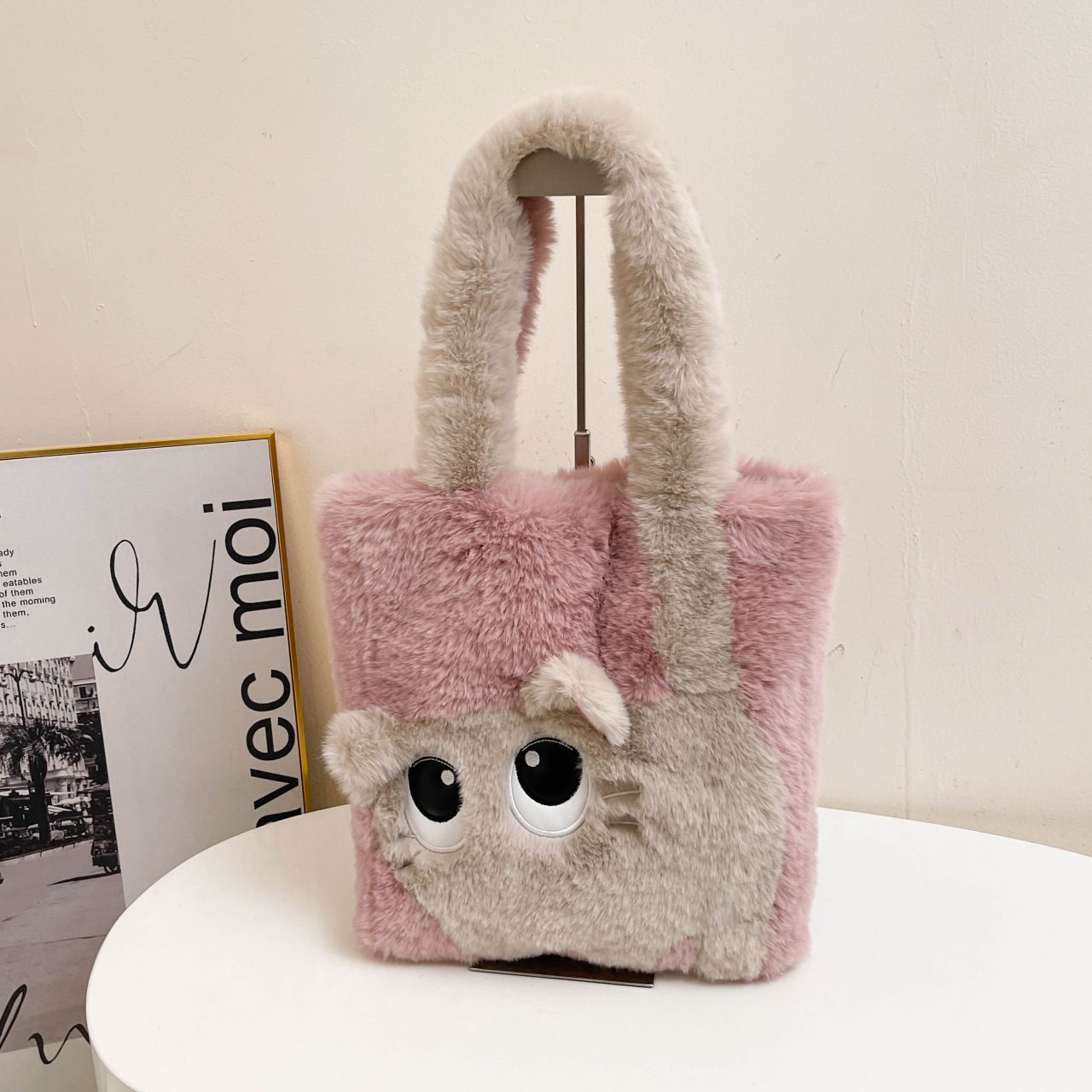 Creative Cat Cartoon Sweet Girl Plush Commuter Bag Autumn Fashion Handheld Single Shoulder Women's Bag Autumn/Winter Plush Bag grey AS PICTURE