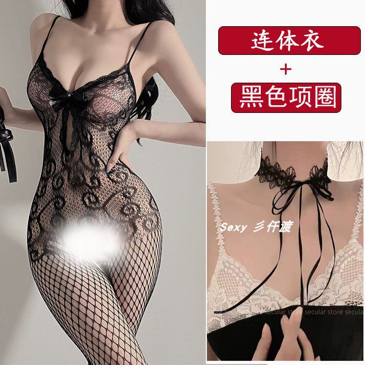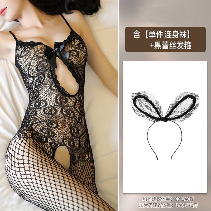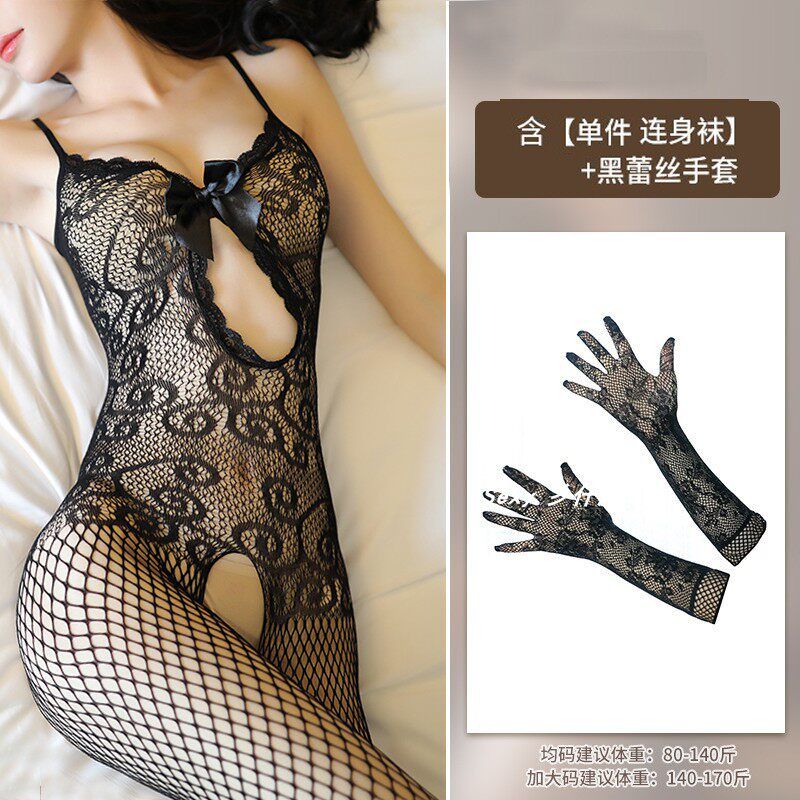Large size fat mm sexy black silk suspender one-piece one-piece romantic lingerie pure desire uniform open fishing net stockings