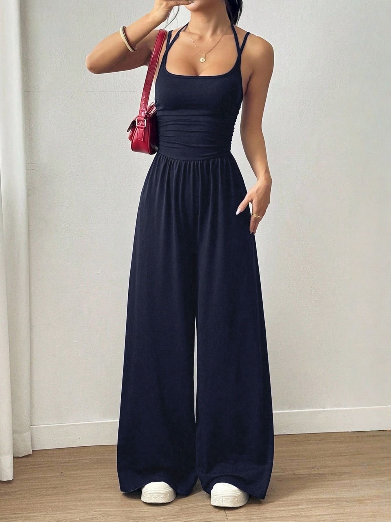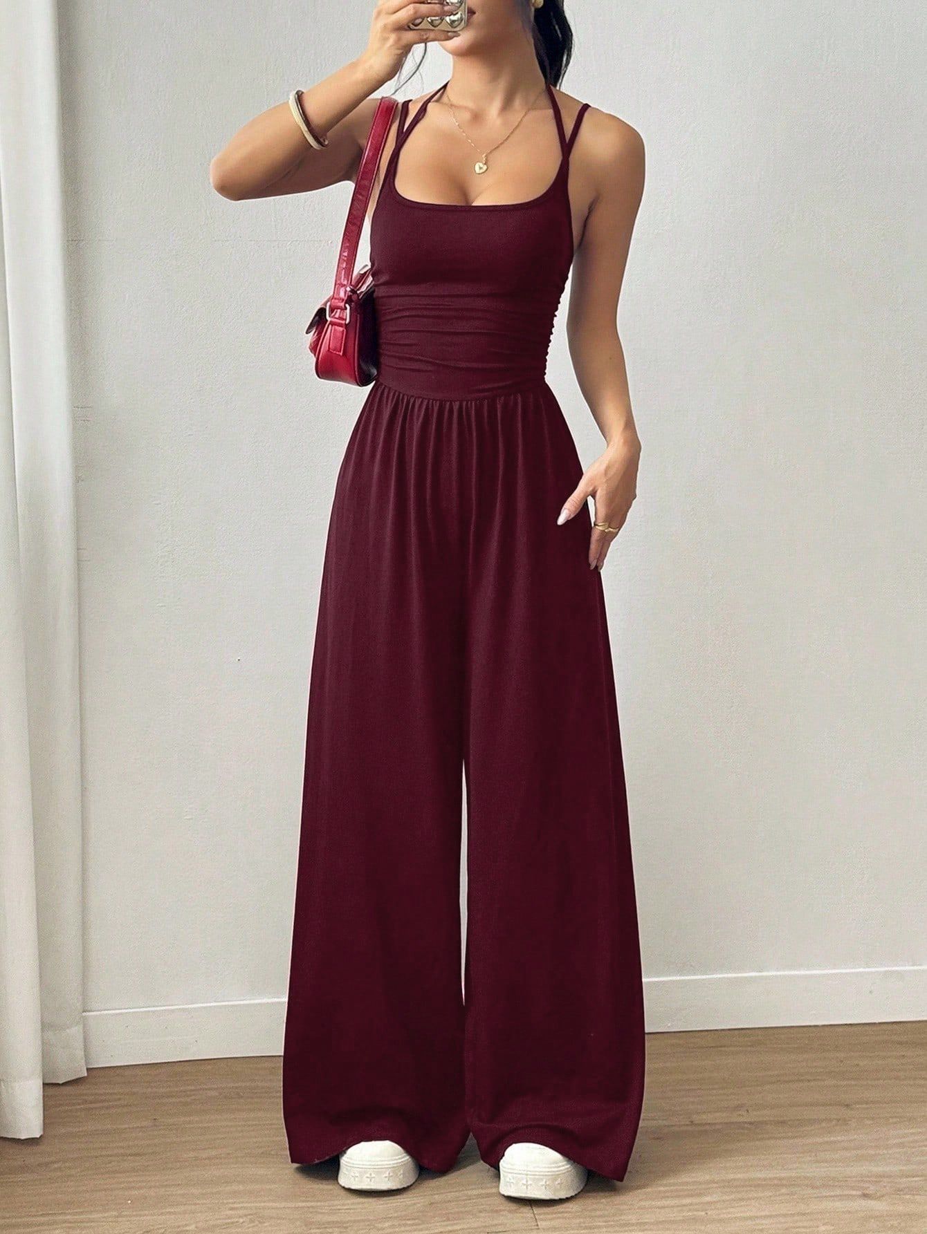 Summer new women's jumpsuit solid color sleeveless suspenders high waist wide leg pants casual jumpsuit suitable for daily leisure commuting parties.