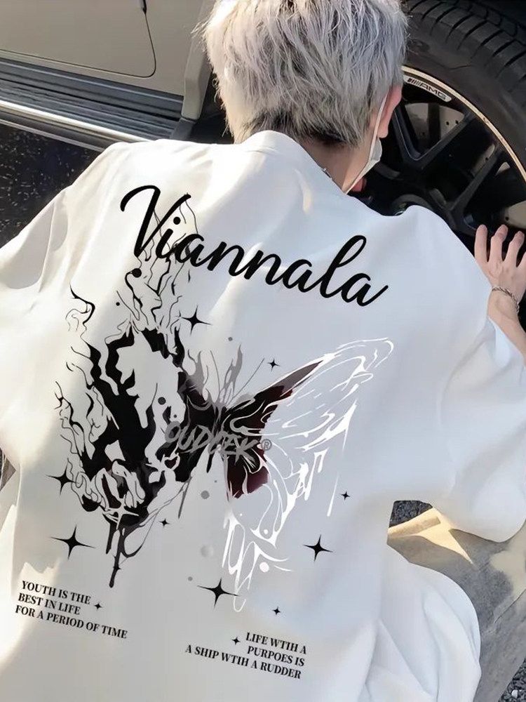 Trendy brand cool and trendy street T-shirt for boys with a high-end feel. Summer pure cotton butterfly short sleeved American high street niche five quarter sleeve