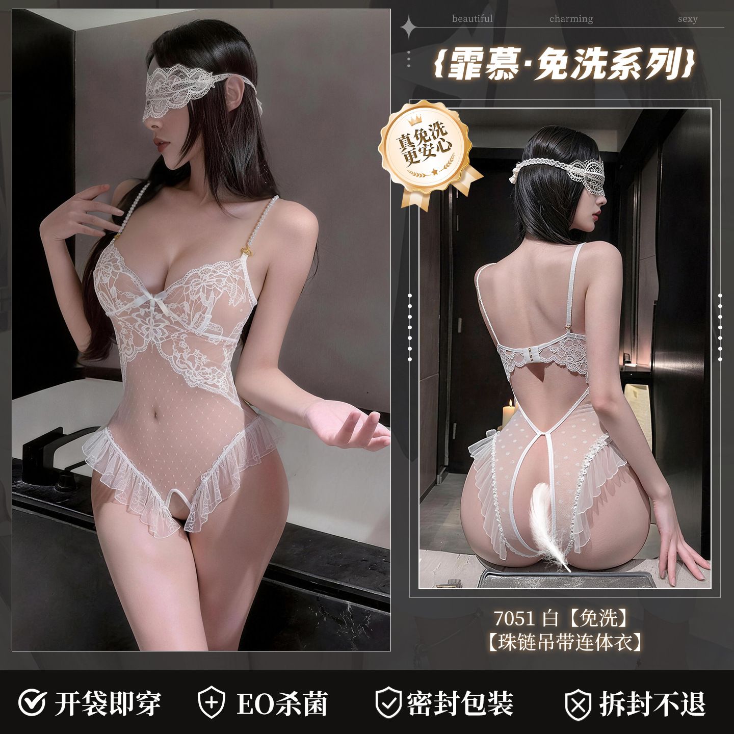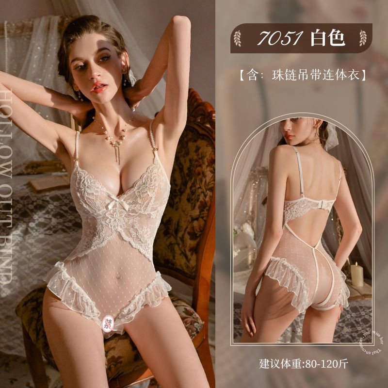 Fei Mu sexy lingerie French lace pearl crotch jumpsuit sexy flirtatious perspective no take off pajamas 7051