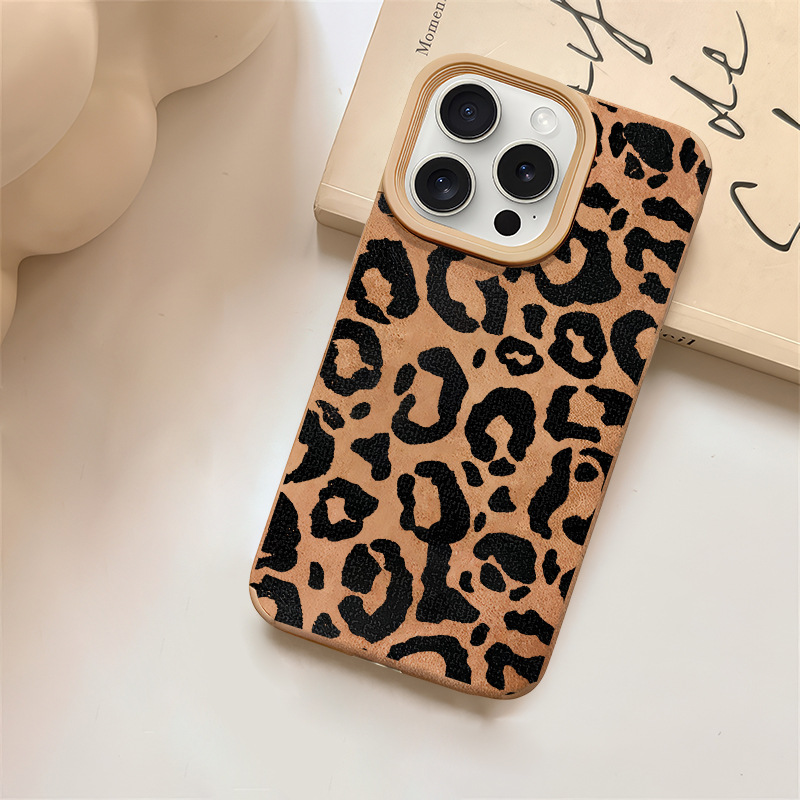 Leopard Print Leather Texture Phone Case for iPhone 11/12/13/16 Pro/17 Pro Max/15 Plus, Fall/Winter Shockproof Cover