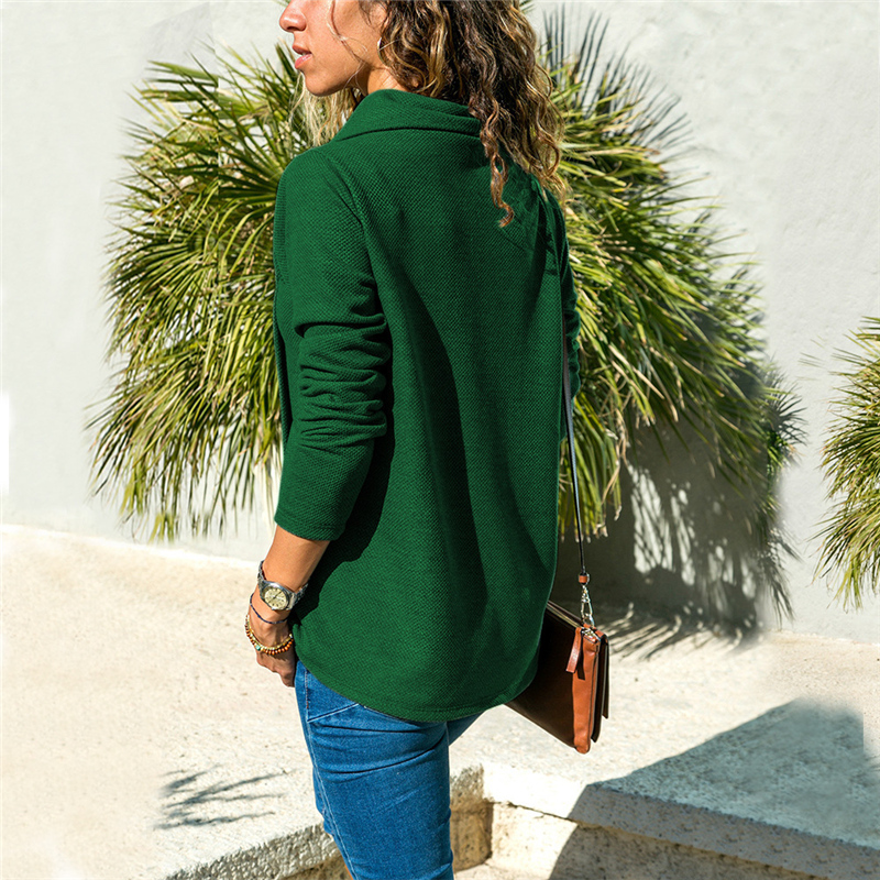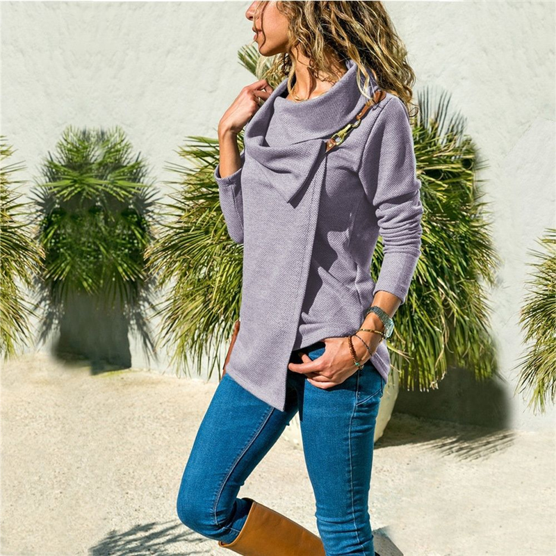 New autumn winter Large lapel Leather metal buckle Women Outer wear Long sleeve T-shirt Ladies Tops