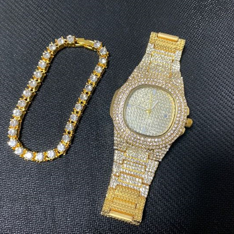 Luxury Men Diamond Watch+Diamond Bracelet Luxury Fashion Gold Men Ice Out Cuban Watch