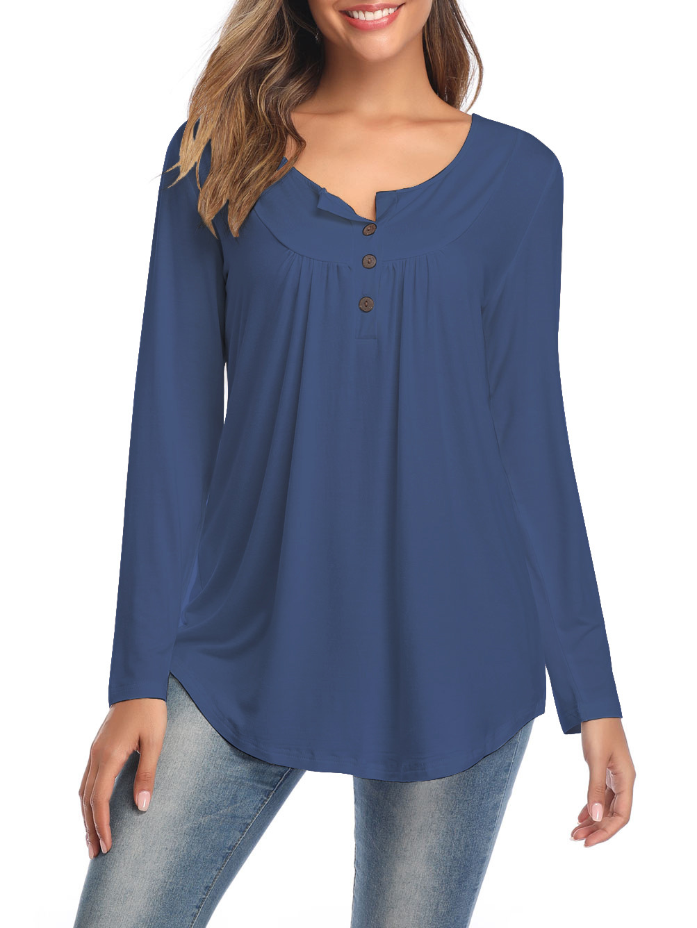 The New Large Size Women's V-neck Button Long-sleeved Shirt Solid Color Pleated Loose T-shirt.