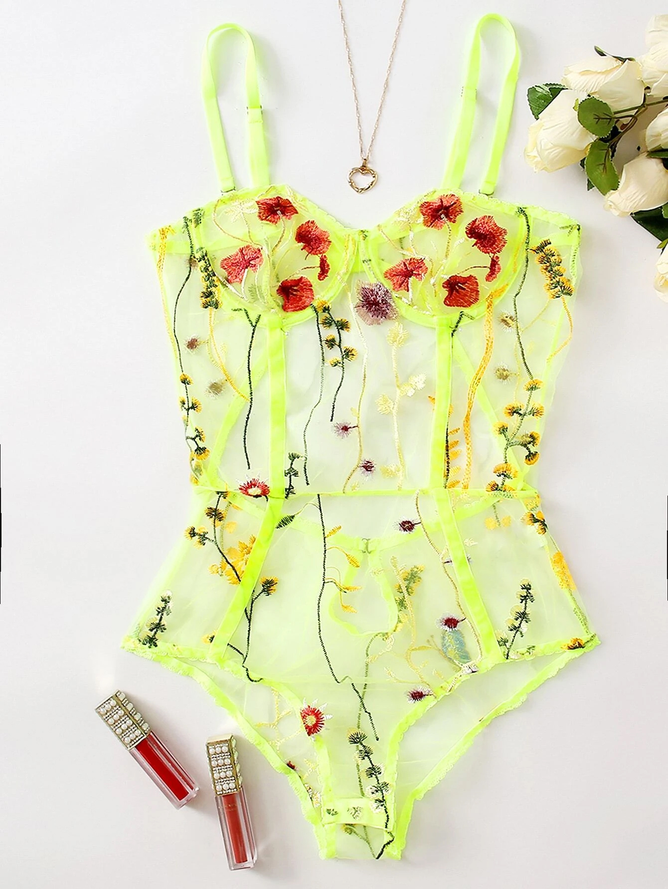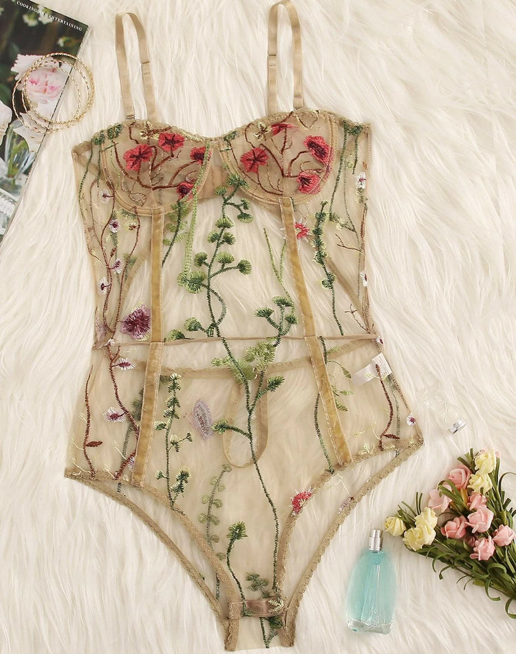 Wholesale new women's suspenders sexy mesh transparent embroidery bodysuits