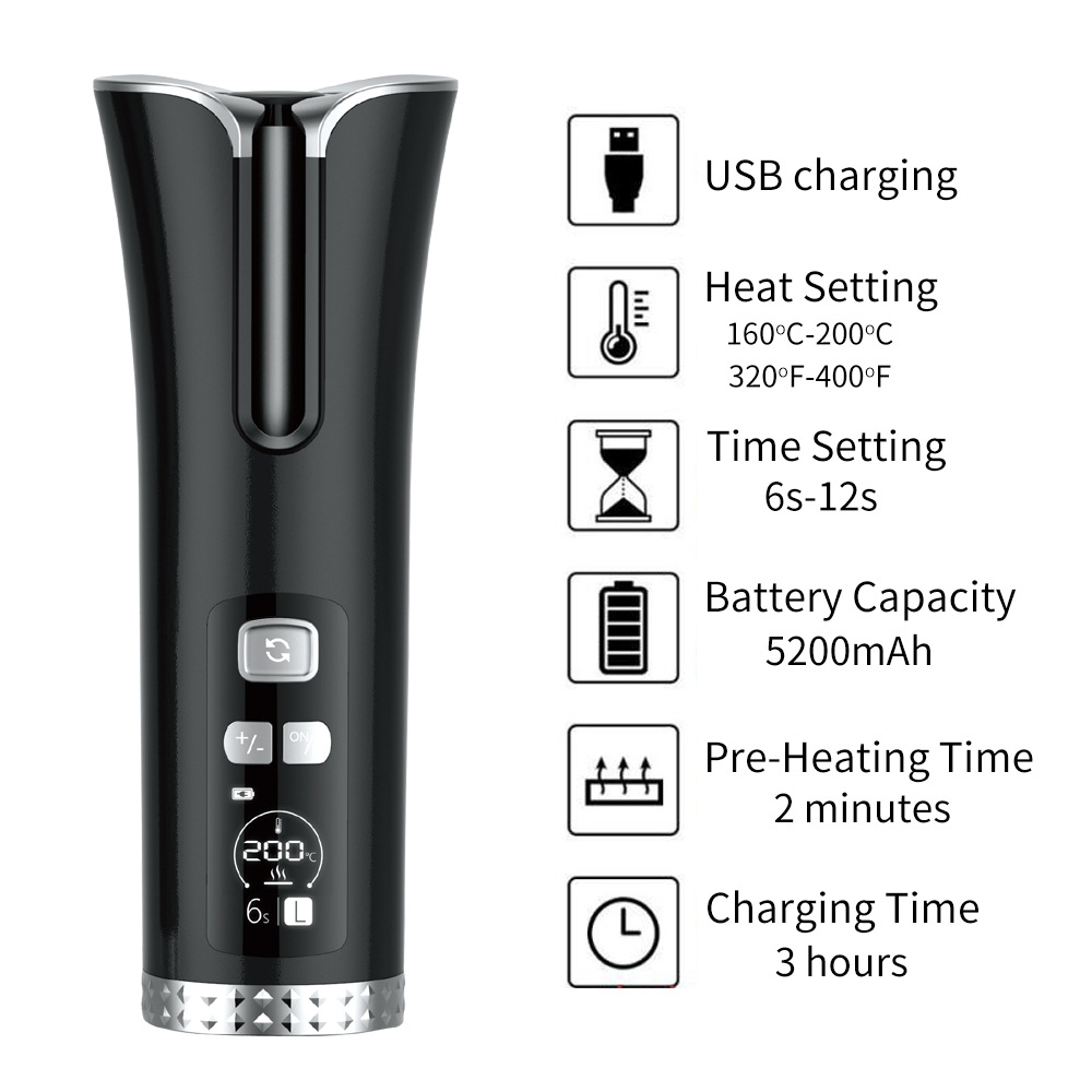5200 mAh Cordless Automatic Hair Curler Rotating Ceramic USB Rechargeable Beach Waves Air Curler Wand Wireless Auto Curling Iron with LCD Temp Display and Timer Styling Tools