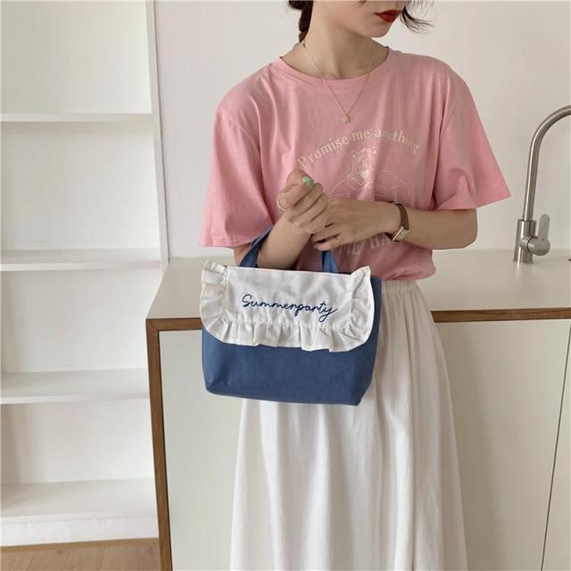 Sweet Ruffled Lunch Bag Korean Style Canvas Small Handbag Solid Color Women Cute Lunch Box Bags Children School Lunch Pouch