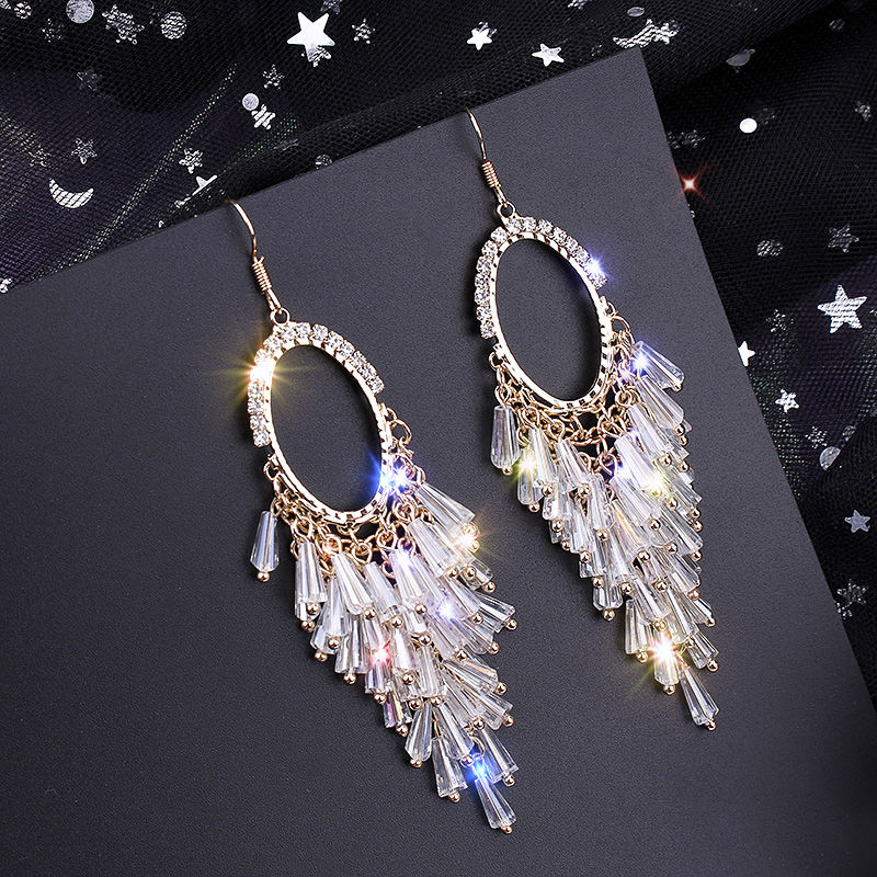 Premium sense earrings Oval crystal tassel earrings temperament niche French exaggerated thin elegant earrings woman