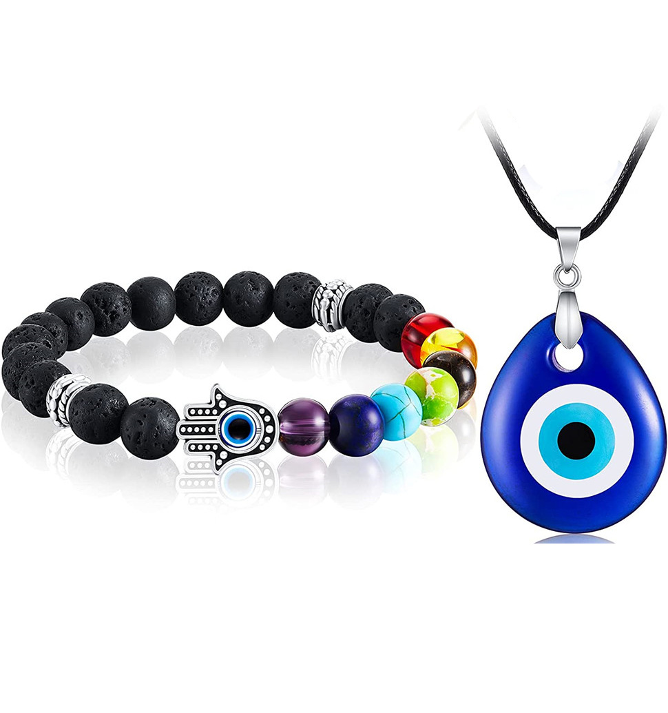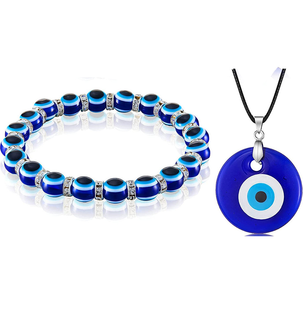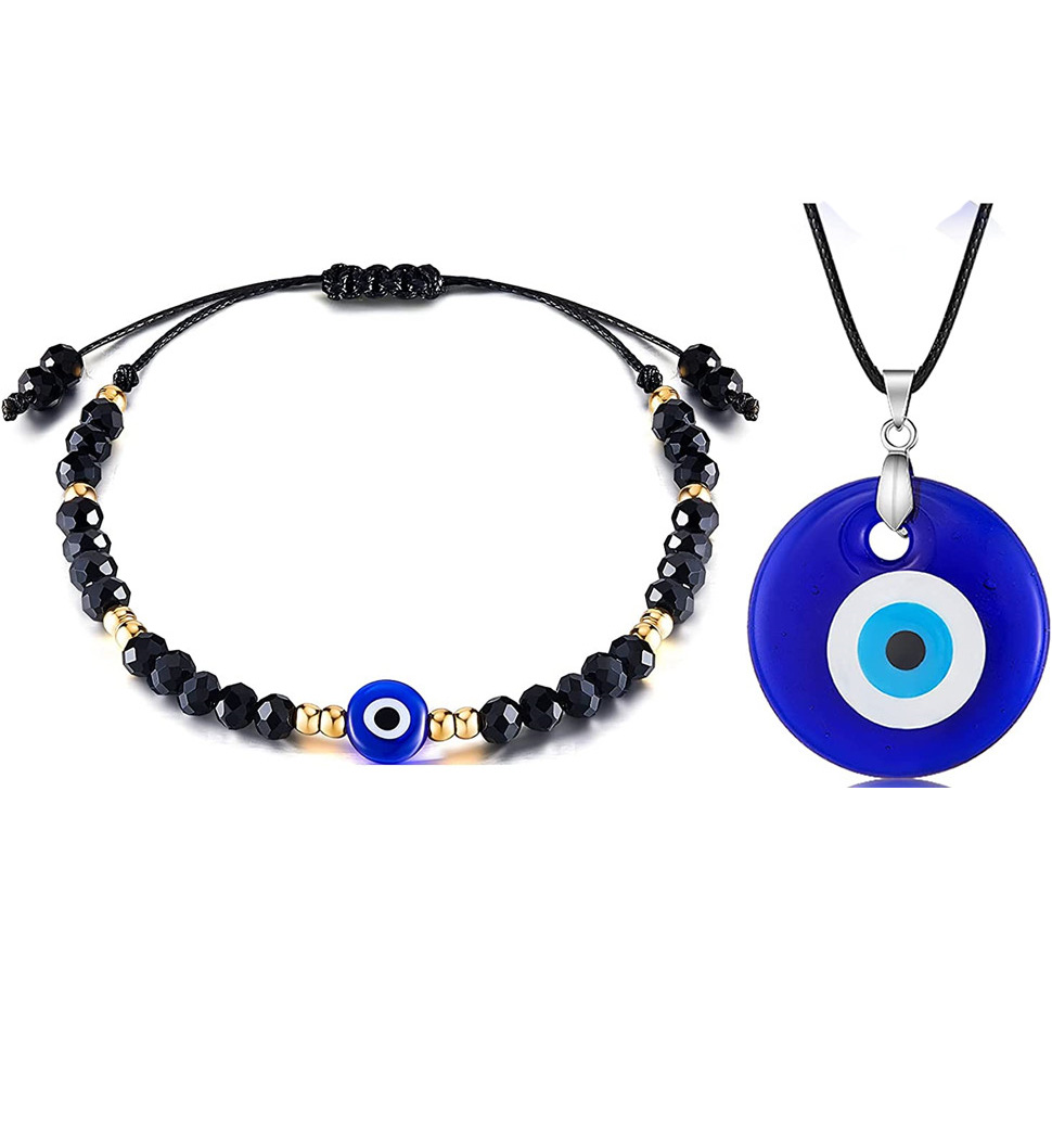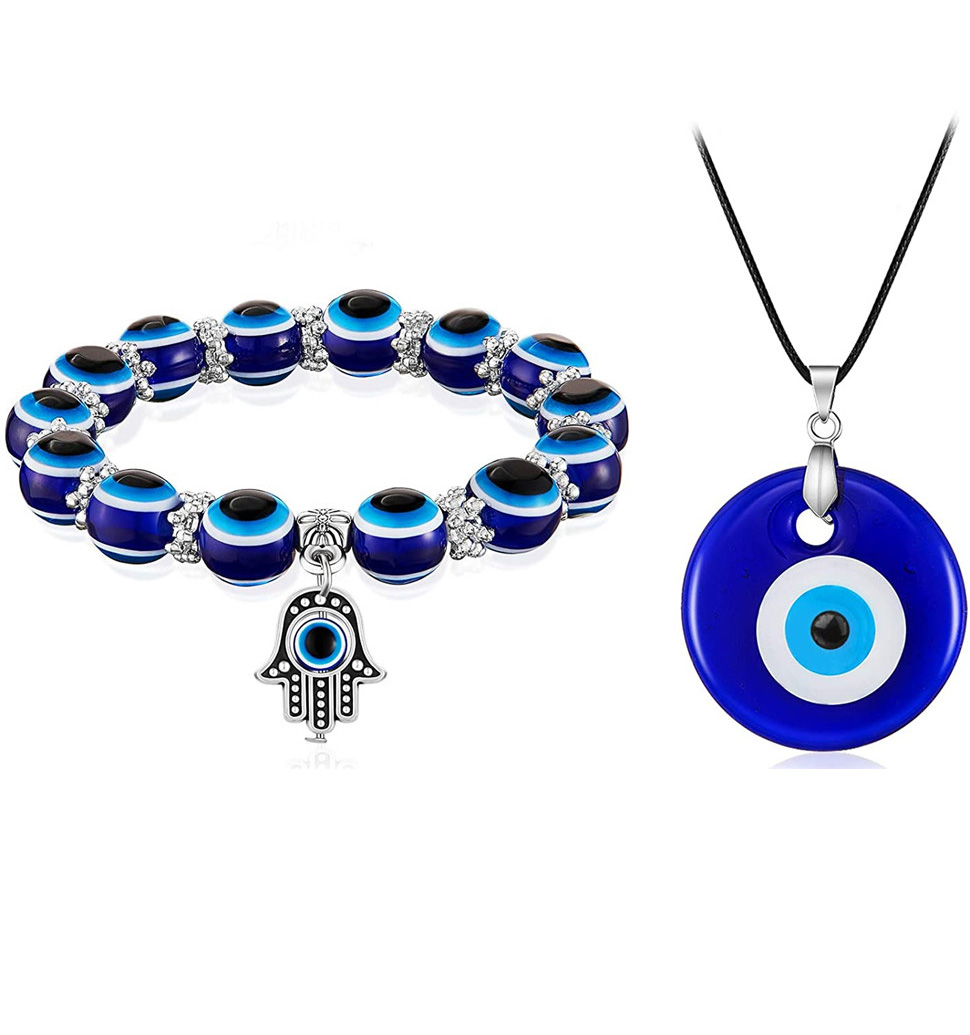 2/4 Pieces Evil Eye Bracelet and Necklace Set Third Eye Jewelry Blue Eye Bead Hamsa Hand Stretch Bracelet and Glass Eye Faux Leather Rope Chain Necklace for Women and Men
