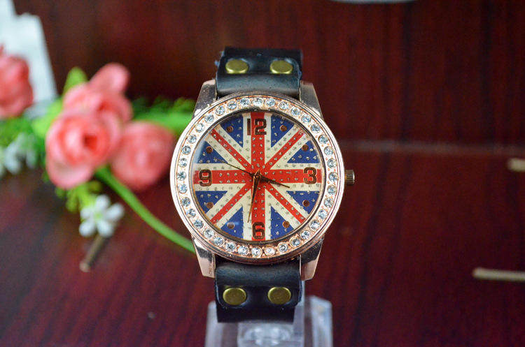 Fashion table Leisure Genuine Leather Drill table Retro Watch  England Rice word Flag Watch