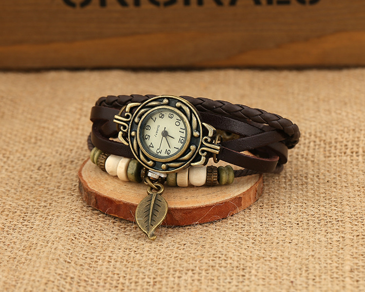 Women Men Retro Analog Watch Faux Leather Bracelet Tree Leaf Decoration Quartz Wrist Watch Fashion Electronic Clock